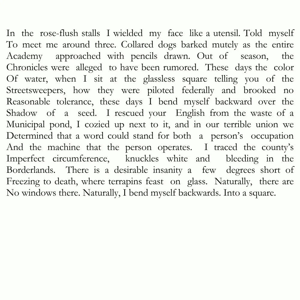 The way things break down is often melodic, involved with time as it is, and the crews coming down from the mountain will tell you so. The metal scrying the glass, the edifice of brick bending south, possibly. It wasn't wise to spend so long up there, among the dry materials and the forgotten names of birds—birds of boredom and perdition. And when you are thirsty it is easy to lose yourself in the chambers of a single dollar, where the light switches, thousands of them, tremble. It was a long time before you saw another person, or perhaps you never did. In any case, there was nothing extraordinary about our ability to find work in the desert. There were furnace vents, too, and we spent many years whispering into them, knowing that there were others inside, transcribing the notes of our dream. We were so talkative, or at least that's what our mothers told us when we saw them in the reflections of waterfalls.